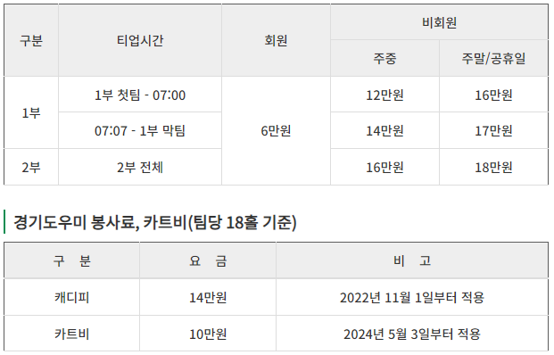 1부 주중 120,000원(첫팀) 140,000원(막팀)/주말 160,000원(첫팀) 170,000원(막팀)