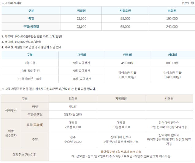 카트비는 대당 100,000원/캐디피는 140,000원 입니다.