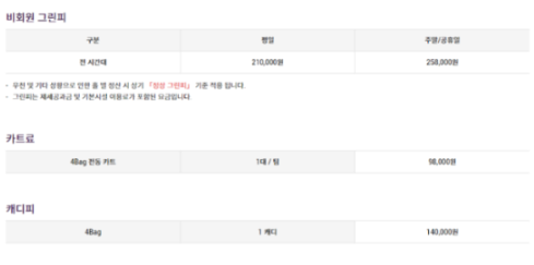 비회원 그린피 평일 210,000원/주말(공휴일) 258,000원