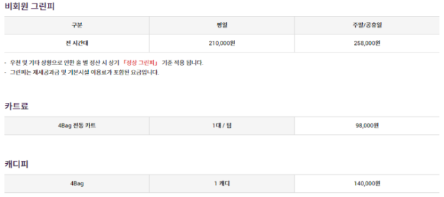비회원 그린피 평일 210,000원/주말(공휴일) 258,000원