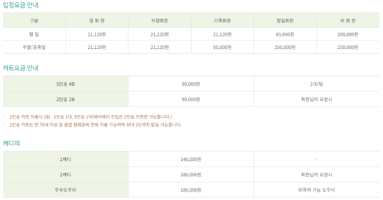 카트비는 팀당 90,000원/캐디피는 140,000원 입니다.