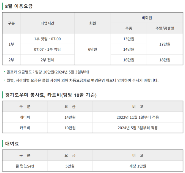 1부 주중 13만원(첫팀) 14만원(막팀)/주말 17만원